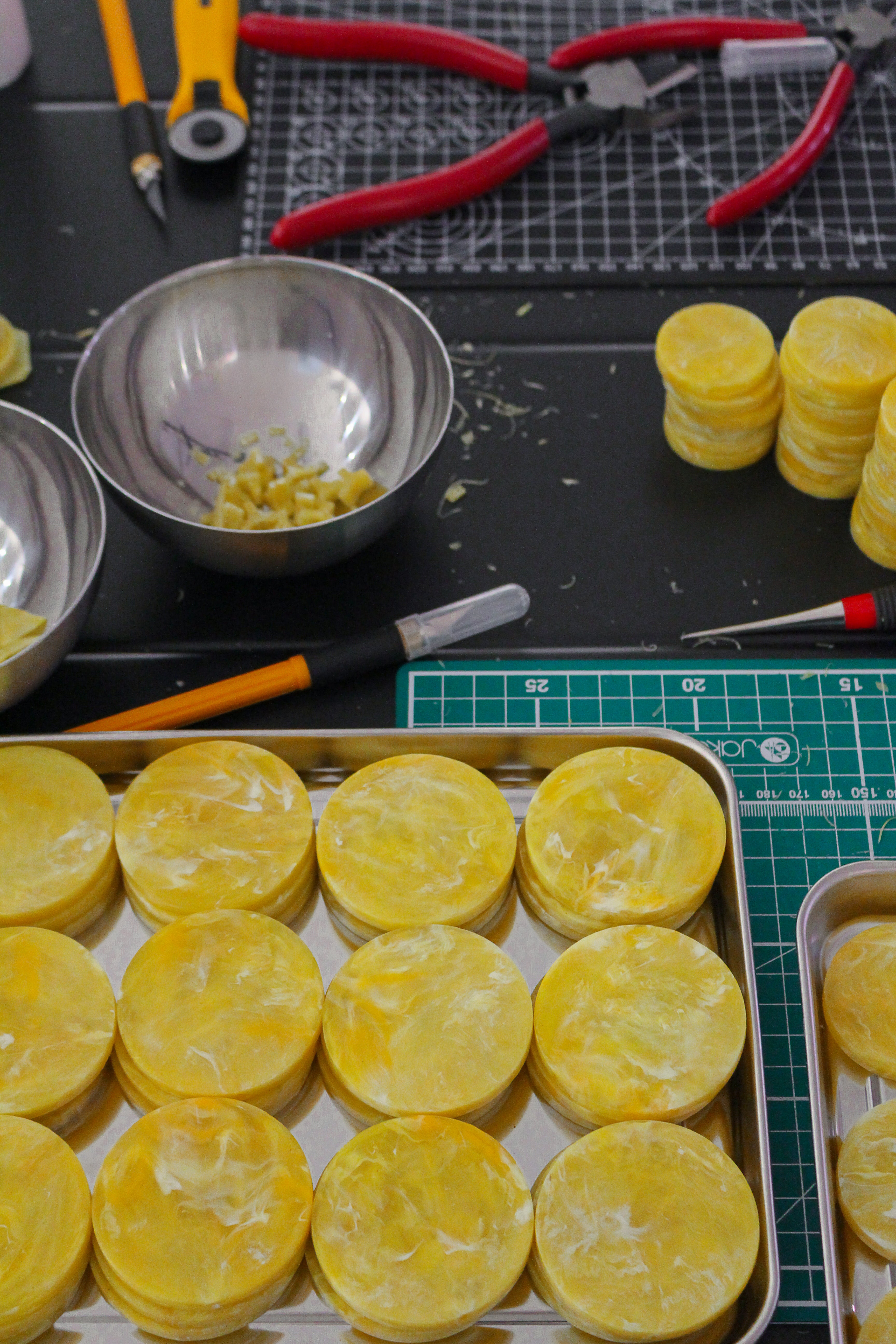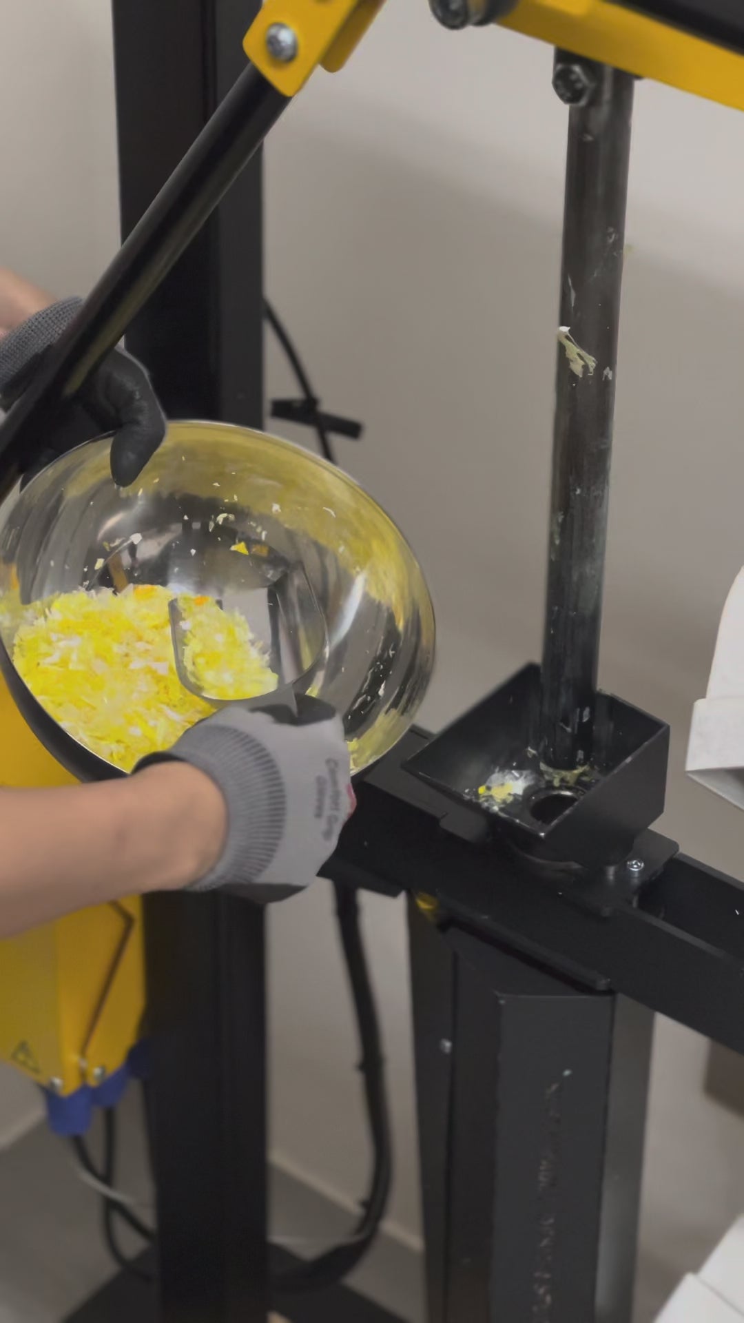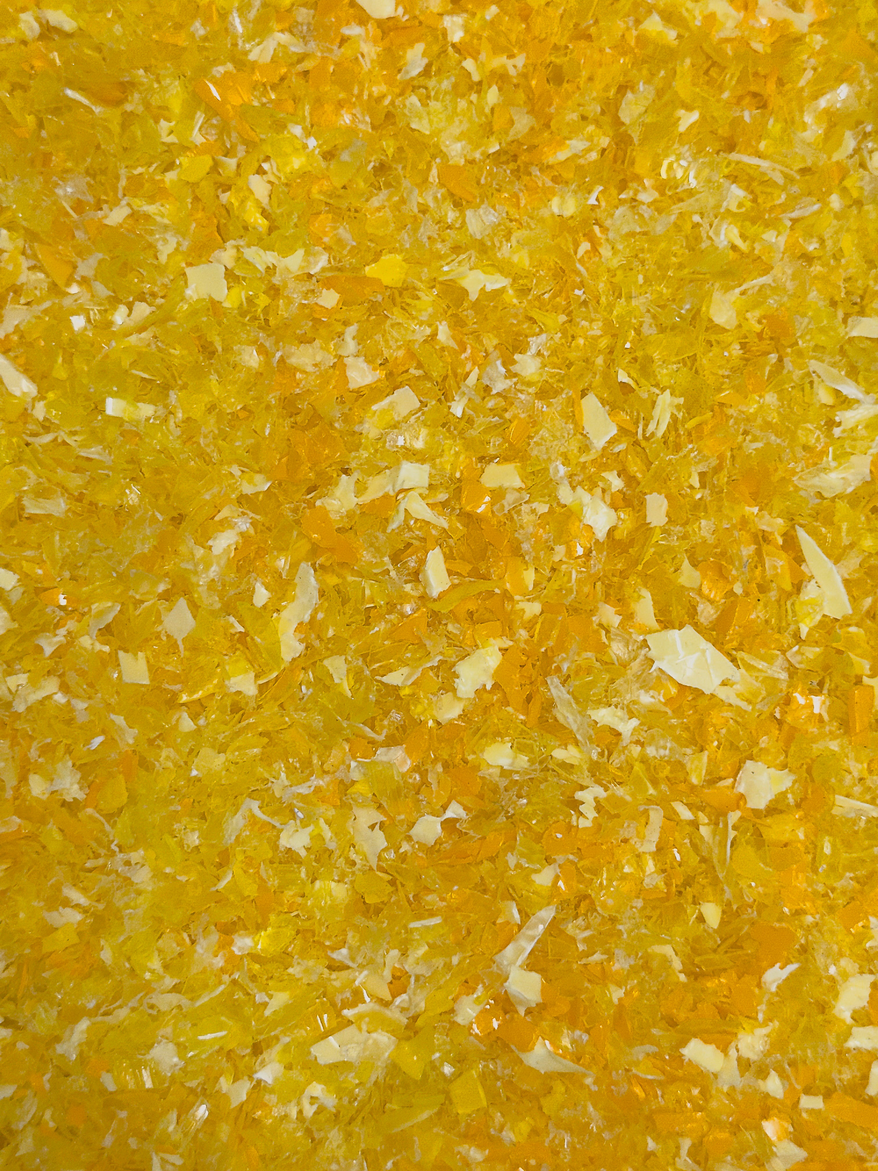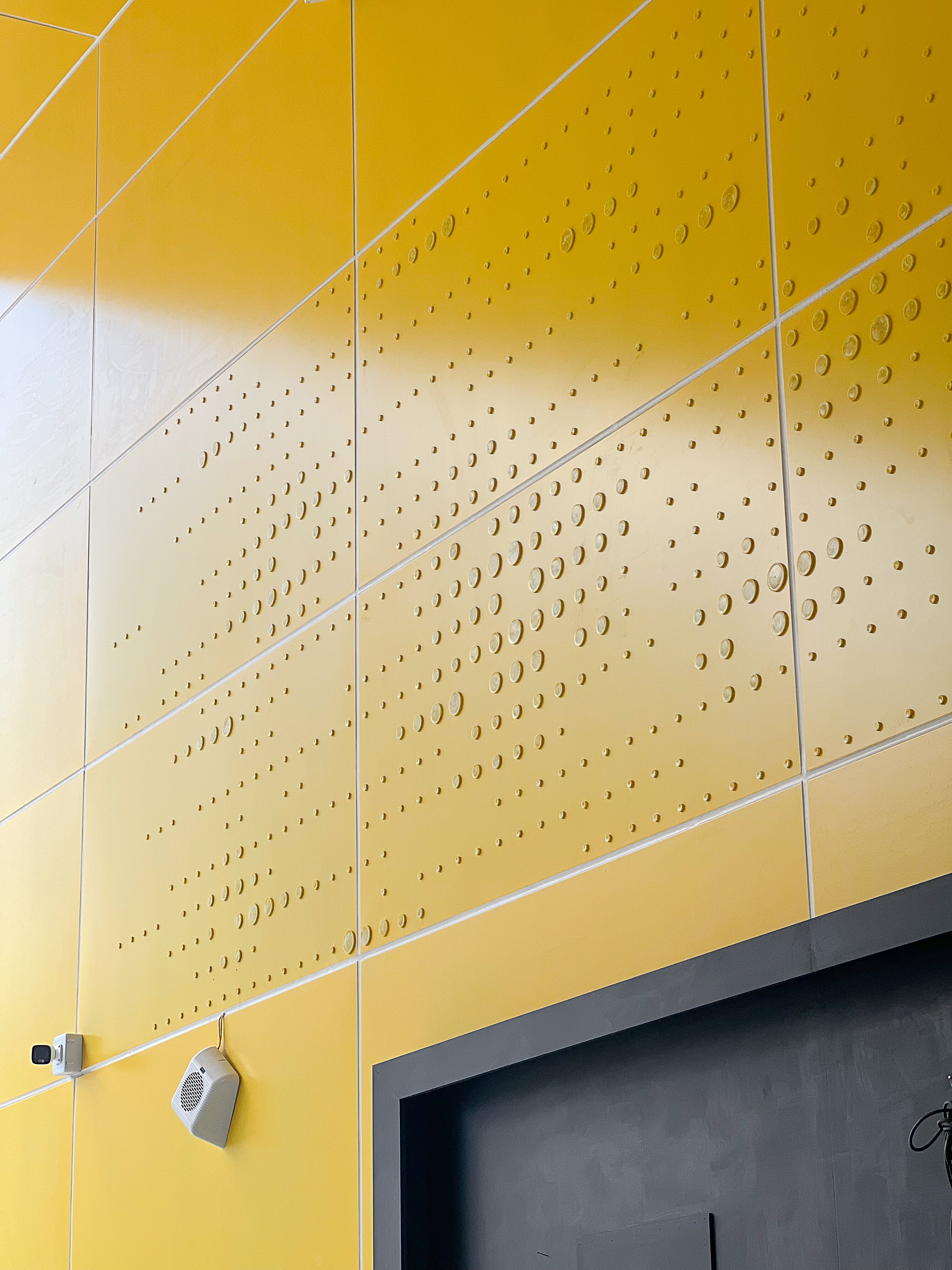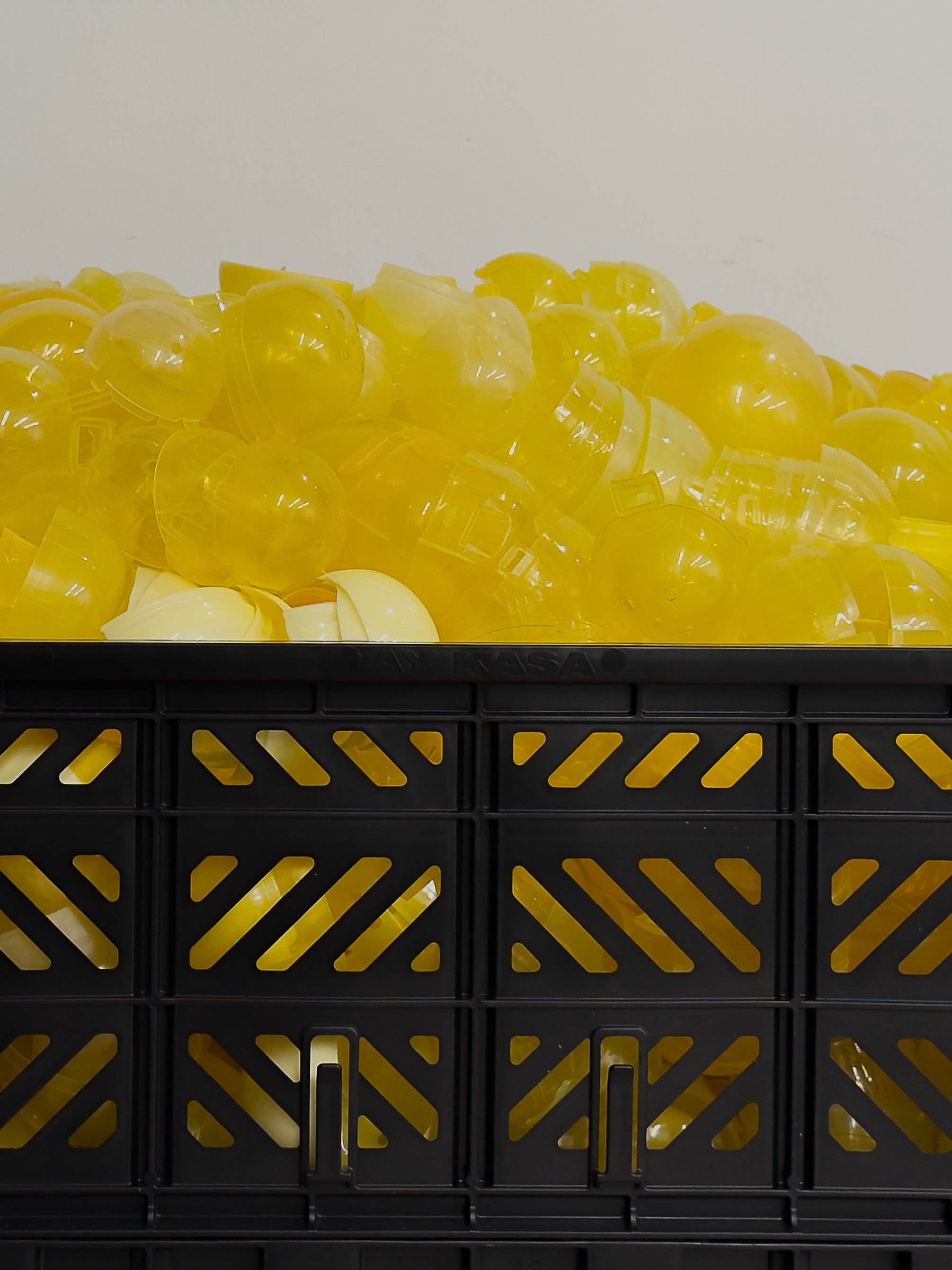 for this work, 5 kgs of recycled gacha capsules were transformed through two rounds of color development and more than 30 experiments, resulting in 1,010 circles ranging from 2 to 7 cm. against the yellow aluminum panels, the circles ripple outward like light itself, offering a gentle sense of joy and hope along the way.
