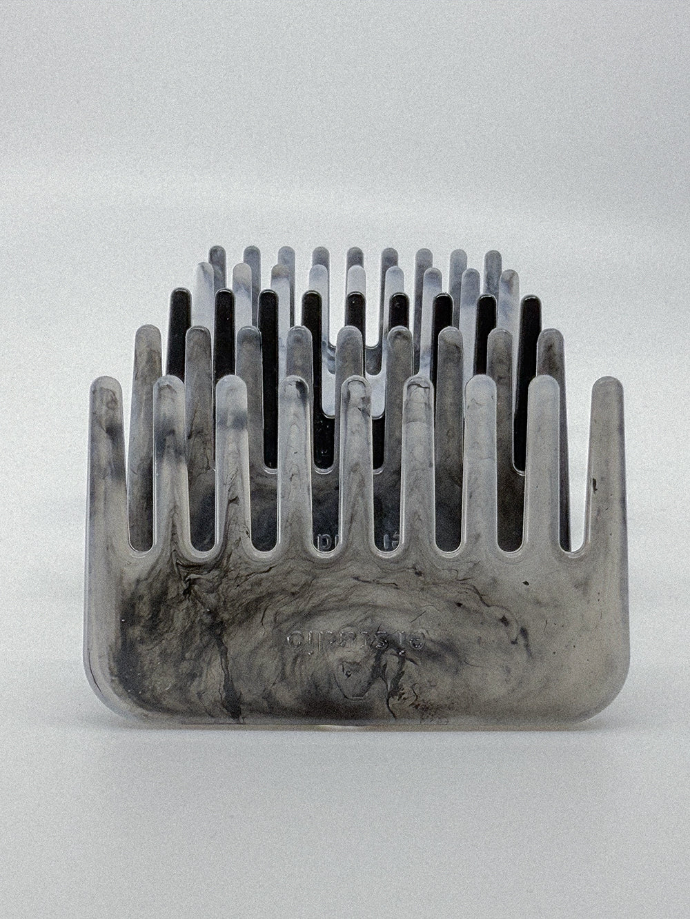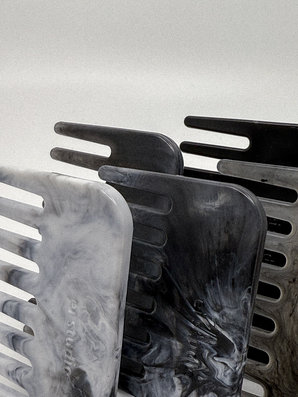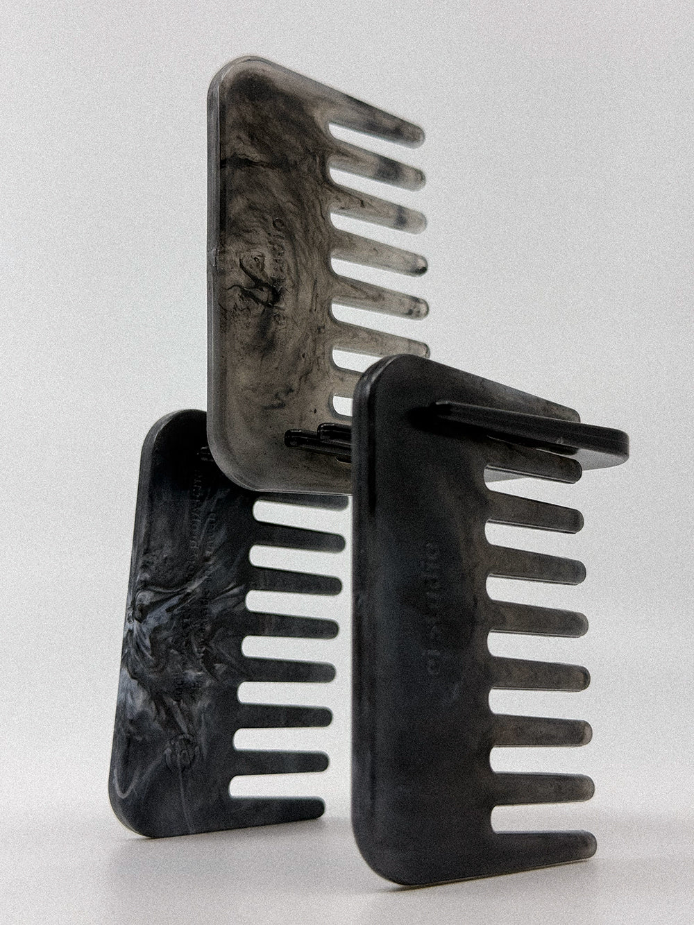 our 100% recycled pp combs are crafted from 30g of recycled single-use plastics, combining functionality and sustainability in a compact design. inspired by the size of a standard business card, these combs fit perfectly in your pocket, making them easy to carry wherever you go. the neutral design caters to all users, while the harmonious color options, drawn from nature, and soft organic patterns created during the plastic extrusion process ensure each piece is truly one of a kind. a practical yet elegant accessory for on-the-go grooming.