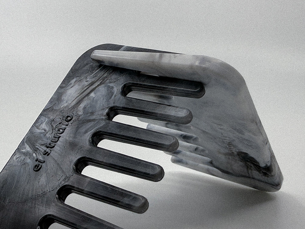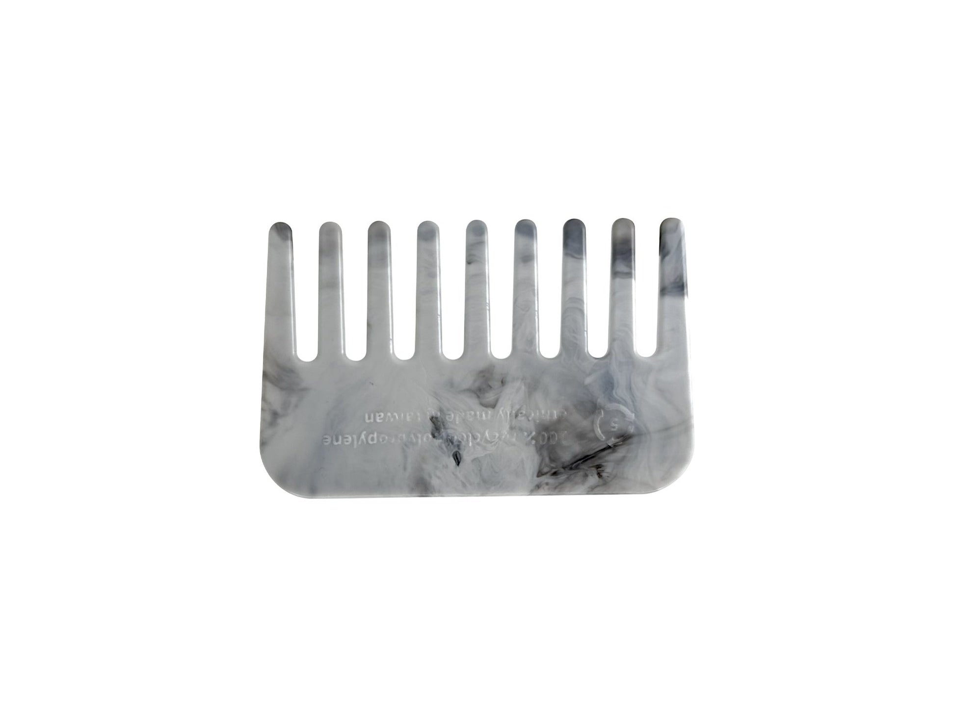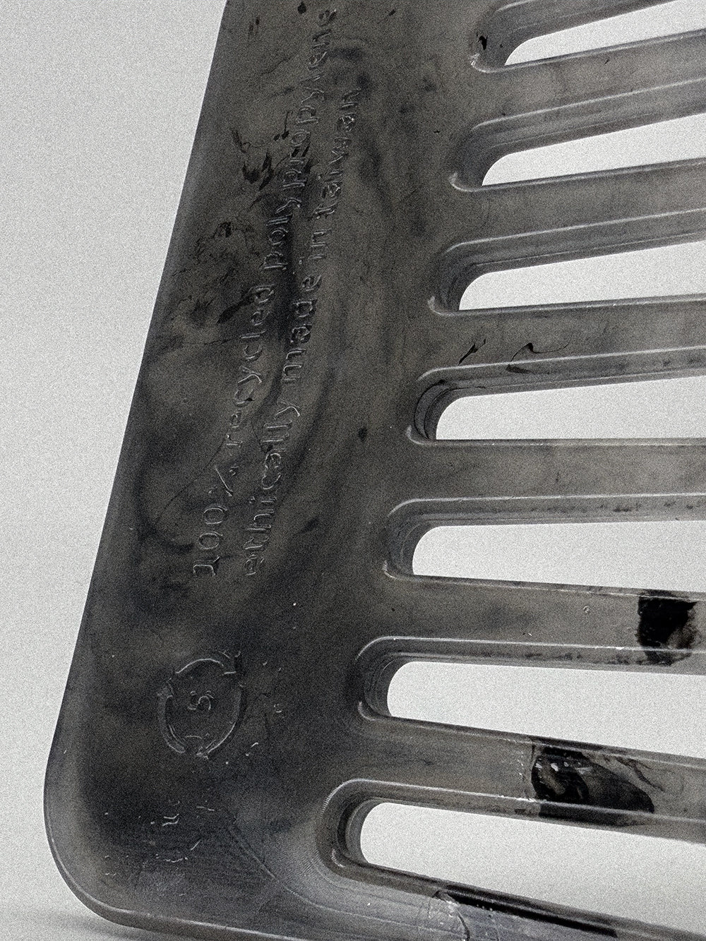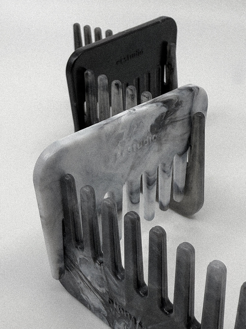 our 100% recycled pp combs are crafted from 30g of recycled single-use plastics, combining functionality and sustainability in a compact design. inspired by the size of a standard business card, these combs fit perfectly in your pocket, making them easy to carry wherever you go. the neutral design caters to all users, while the harmonious color options, drawn from nature, and soft organic patterns created during the plastic extrusion process ensure each piece is truly one of a kind. a practical yet elegant accessory for on-the-go grooming.