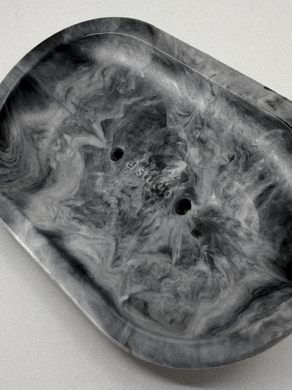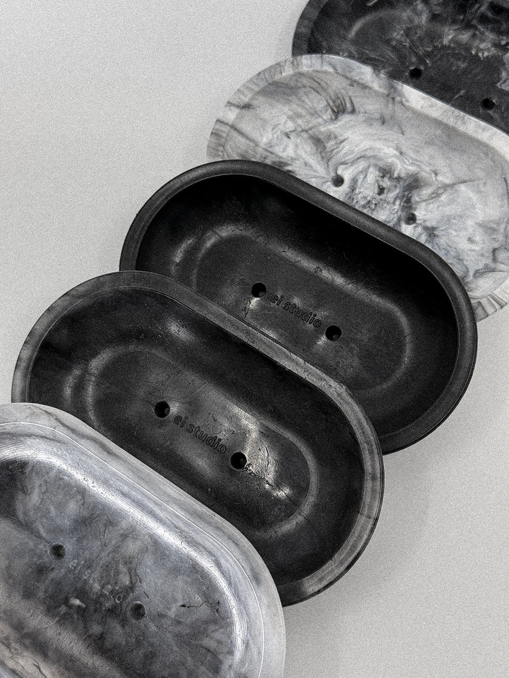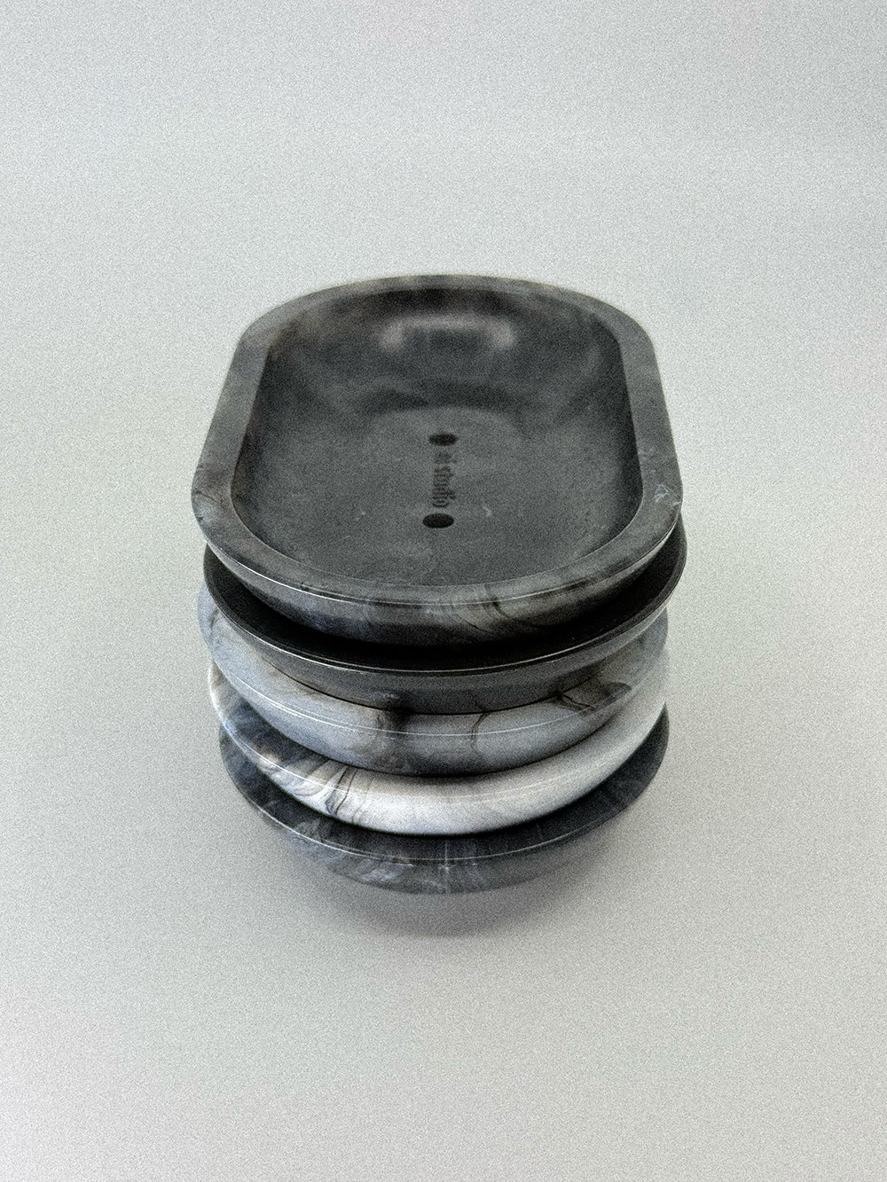 the soap dish is crafted from 60g of recycled single-use cutlery and takeaway food containers. made entirely from type 5 pp plastics collected across taiwan, it reflects our commitment to circularity. this dish transcends its function as a simple accessory, serving not only as a soap holder but also as a tray for jewelry, keys, or even as a base for crystals and diffusers, embodying our circular design philosophy by transforming regenerative materials into something purposeful.
